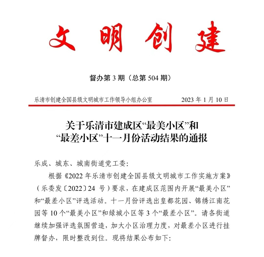 根據(jù)《2022年樂清市創(chuàng)建全國縣級文明城市工作實施方案》(樂委發(fā)〔2022〕24 號)要求,在建成區(qū)范圍內(nèi)開展的十一月份“最美小區(qū)”評選中,我司在管項目,上海花園,時代御峰,人才大廈榜上有名,其中時代御峰與人才大廈均已多次入選。